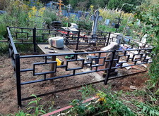 Затем мы приступили к монтажу заранее привезённой на кладбище простой металлической оградки. Параллельно с установкой ограждения мы окончательно очистили участок, а также сварили металлический каркас по периметру могилы. Он не только придаст дополнительную жёсткость ограждению, но и послужит бортами для будущего покрытия.
