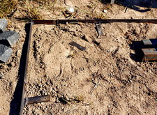Приступив к работе, мы, первым делом, очистили могилу от травы. Затем положили по периметру места захоронения пятисантиметровую металлическую полосу, которая будет служить границей и дополнительной опорой брусчатке. Получившийся прямоугольник свариваем по углам.